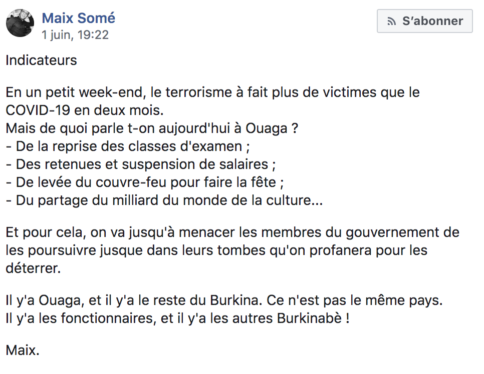 « Pourquoi notre gouvernement ne semble se préoccuper de ses populations que lorsqu’il est question du Covid-19 ? Alors que des milliers de Burkinabè sont morts à cause du terrorisme sans qu’on aie vu ce même engouement ou ce même élan de solidarité ? »